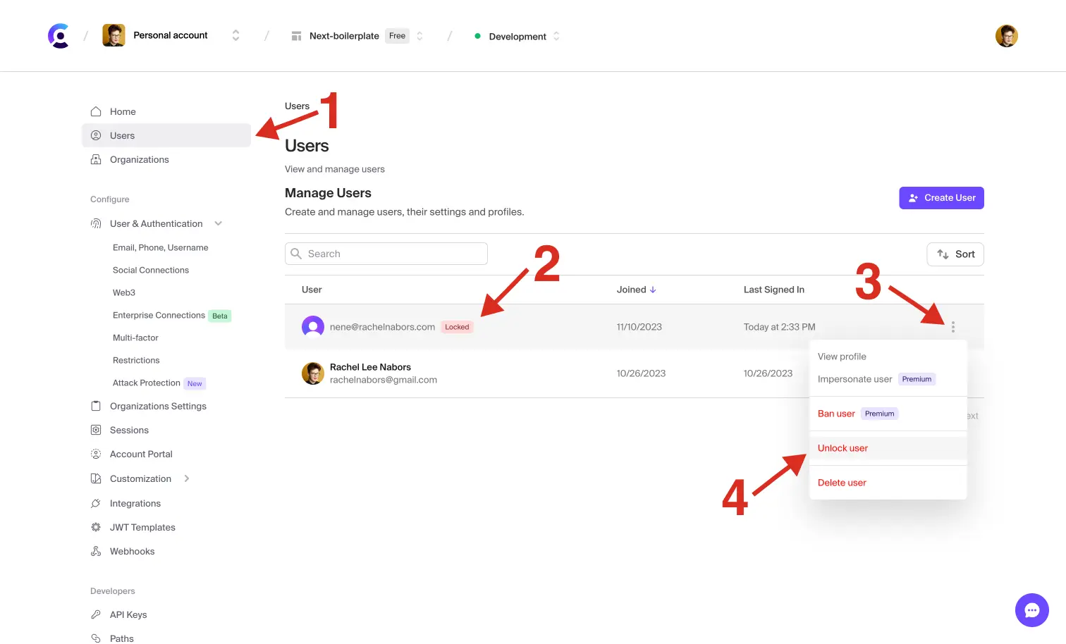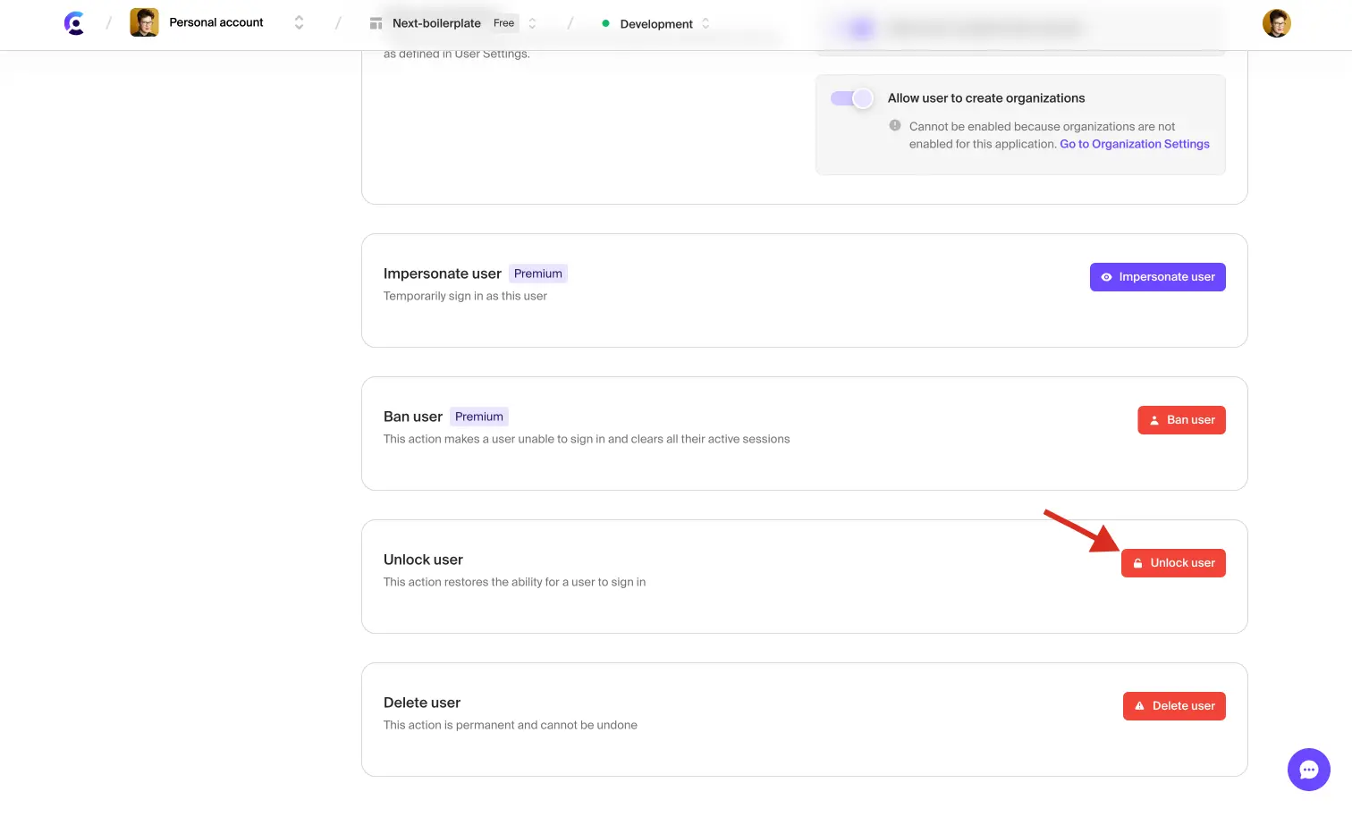 Unlock user accounts from the Clerk Dashboard
